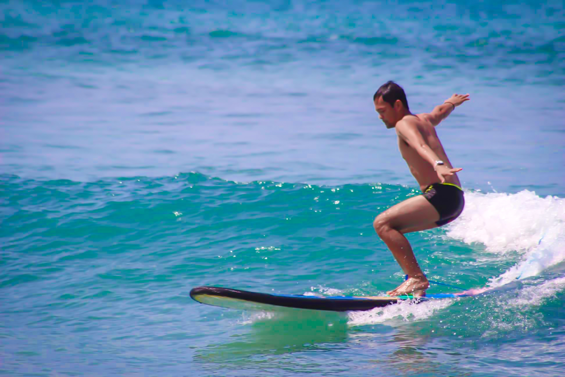 Yudi, my instructor, then asked me to get on the board and paddle farther to where we will wait for the “right waves”. Then he would signal me to prepare, “chicken wings!”, and pushes me for a momentum along with the waves that will serve my ride. I only have few seconds to perform the drill and stand up. If I’m slow and can’t balance up right away, I will reach the shore still lying down so I better go ahead and sleep. HAHA.