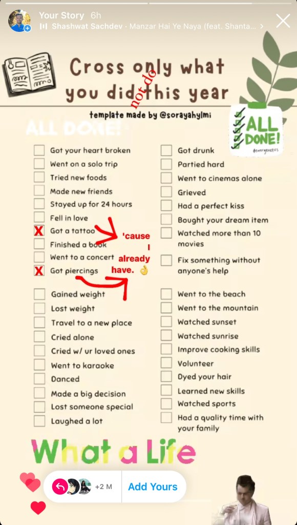 The next day, we were bound to Nagarkot Waterfalls. While on the crowded bus scrolling mindlessly, I stumbled upon my Dentist’s Story which caught my attention. It’s a “What you did this year” checklist where you tick off all you have done in 2023. Since I have done everything except 2, I reposted it excluding tattoo and piercing.